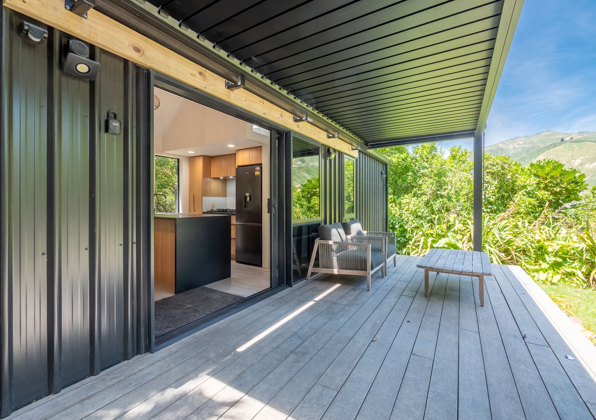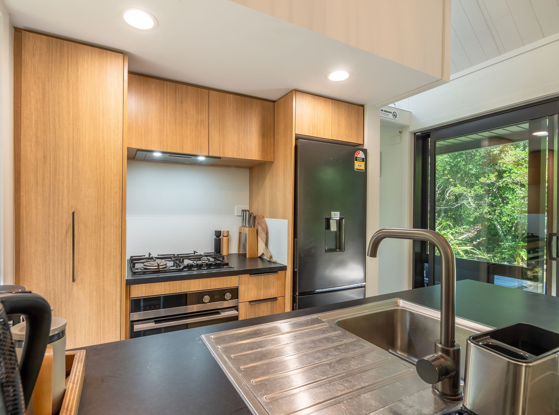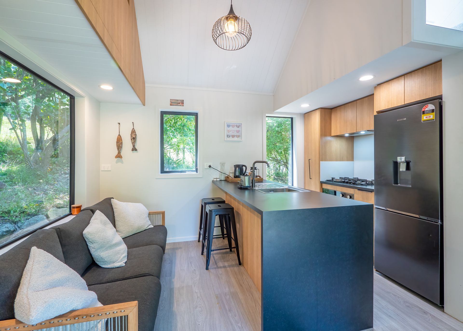 The kitchen is compact and modern and Includes a fridge, freezer, 4 burner gas cooktop, sink, dishwasher, toaster, water kettle, coffee plunger, wine glasses, cutlery and cooking essentials. There are stools at the bar to sit and eat or enjoy the nearby sofa or outdoor seating area!